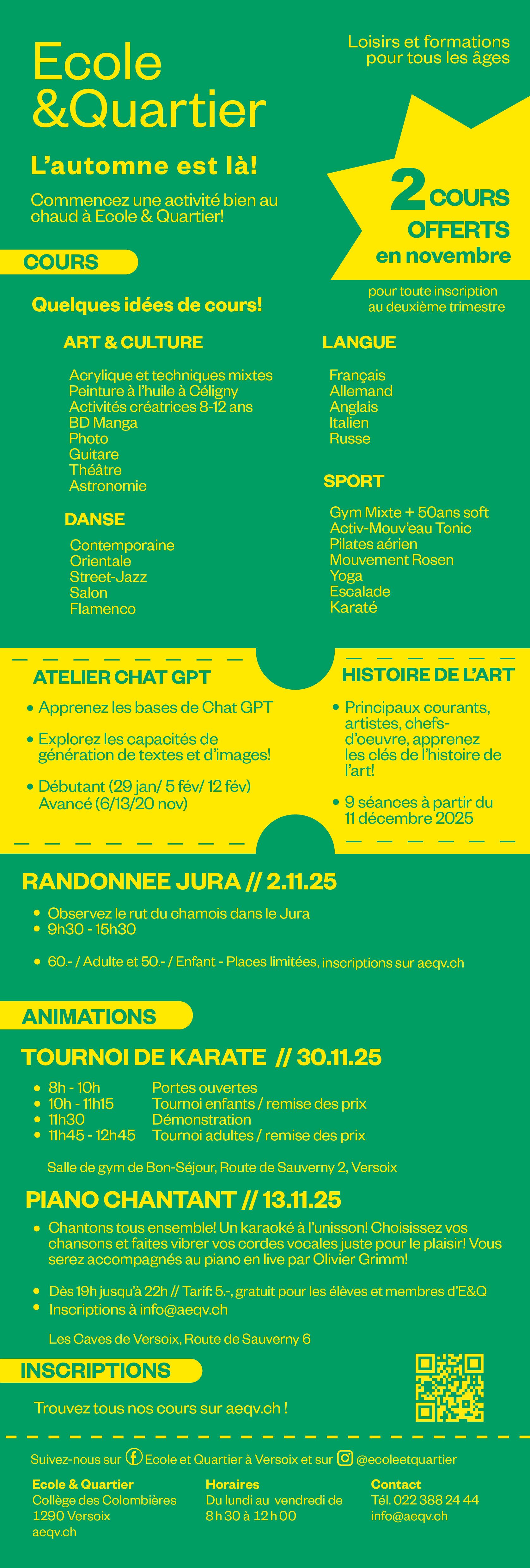 Découvrir nos coursLes animations proposées par Ecole et Quartier sont ouvertes à tous et gratuites pour les membres d’EQ et les élèves. (Fr. 5.- pour les autres)